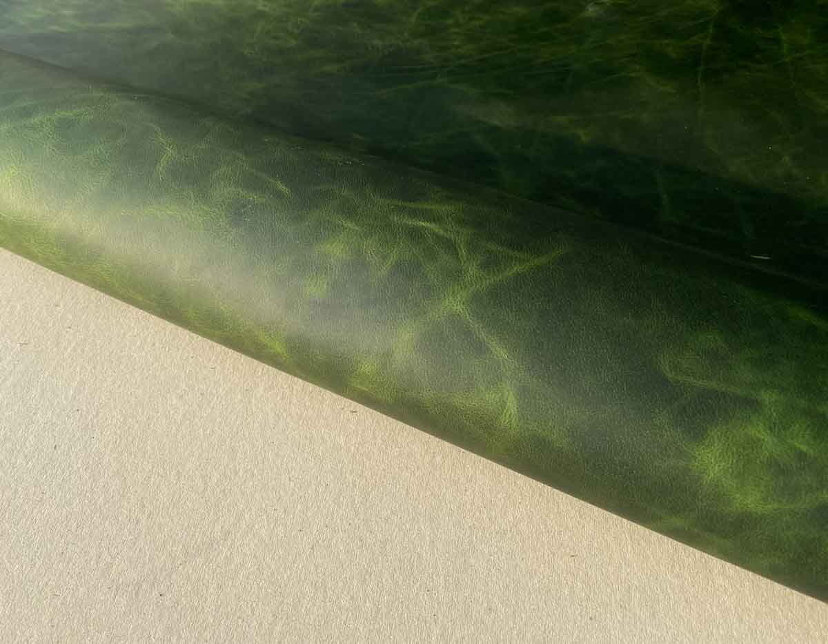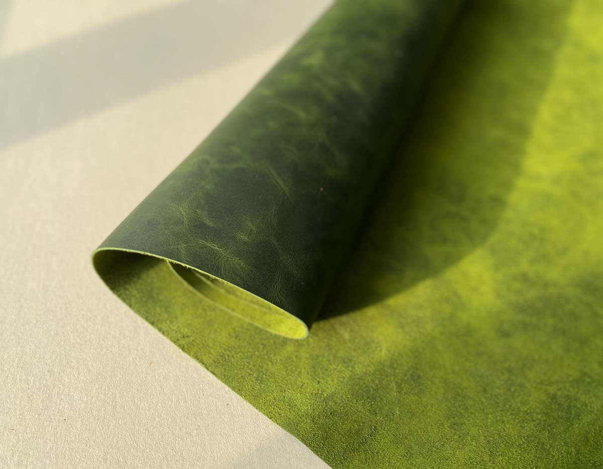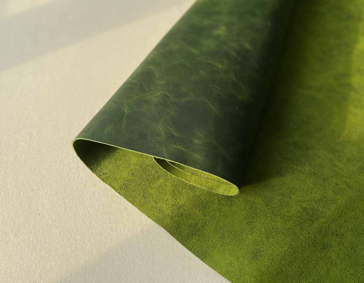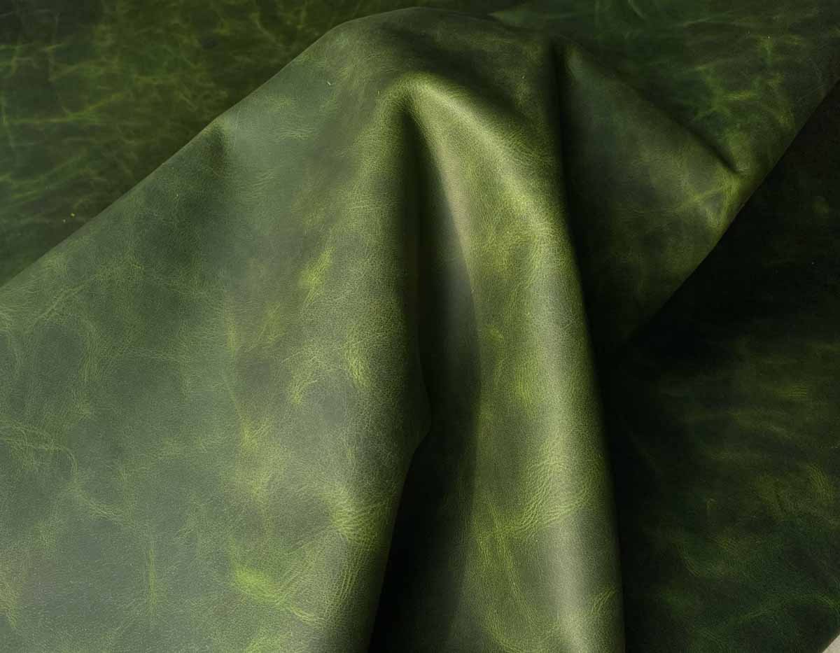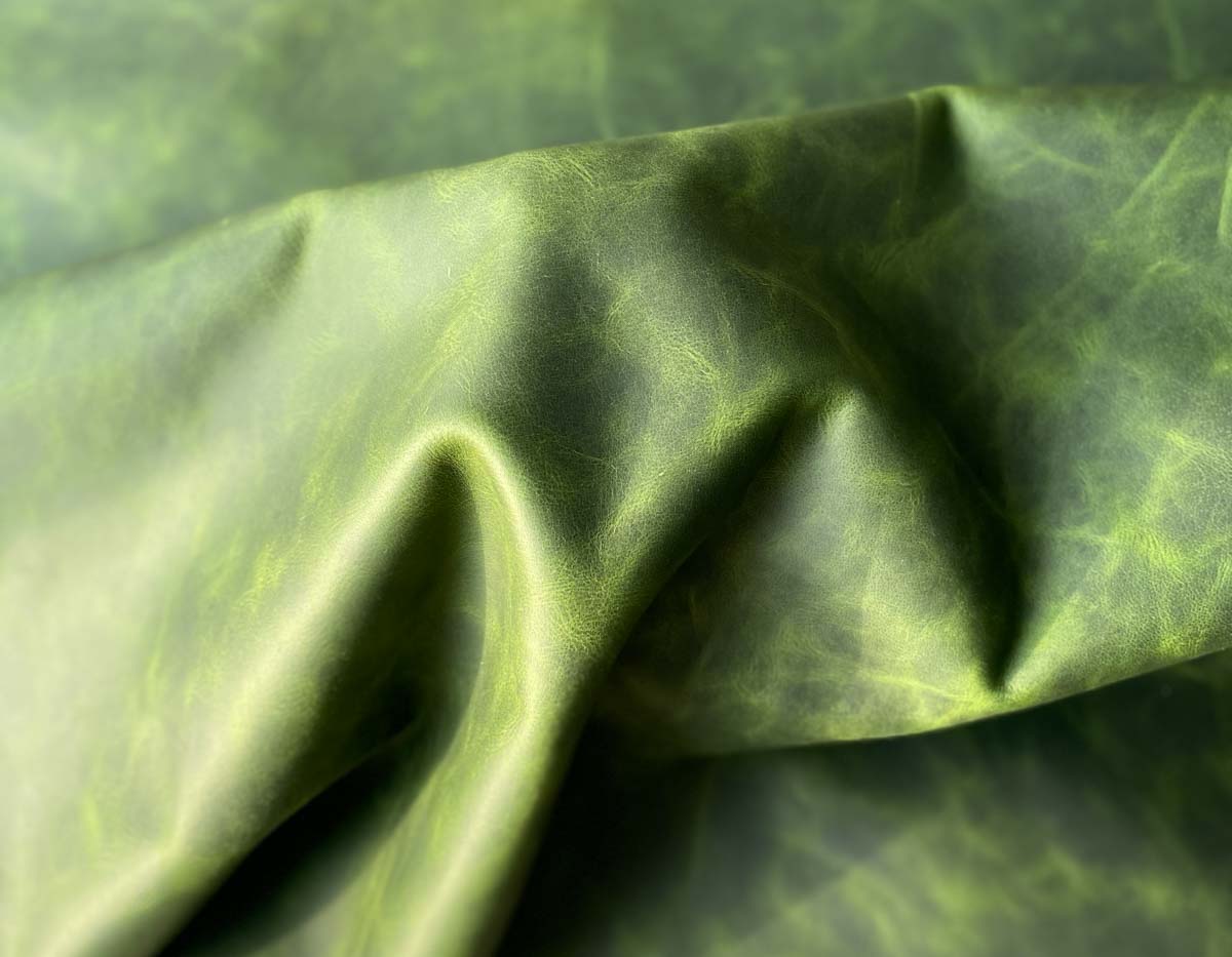 Натуральная кожа смешанного дубления с эффектом пулл-ап, высветляется на изгибах.
